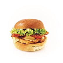 Brie fondu, émincé de poulet fumé, bacon, salade, tomates, oignons frits, sauce barbecue, pain cheddar.